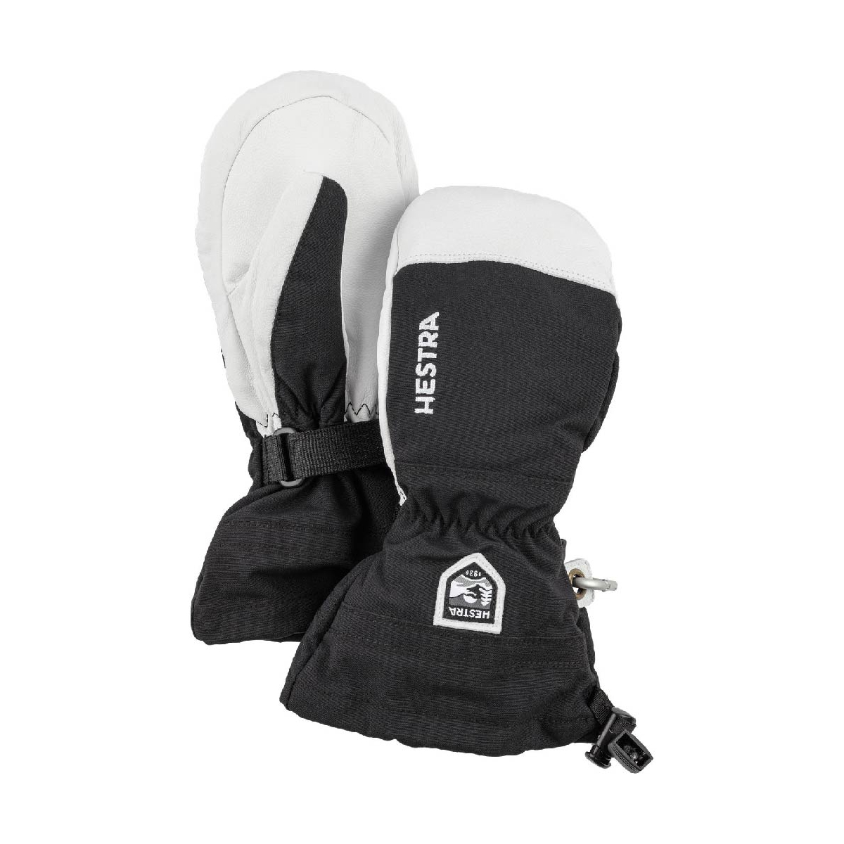 The kids model of Hestra's legendary Heli Ski Mitten is made of soft leather with a slimmer profile and fit for a youth hands A great choice for those who often ski powder and need an extra warm glove. Elastic wrist leashes ensure they stay with them if they are taken off.