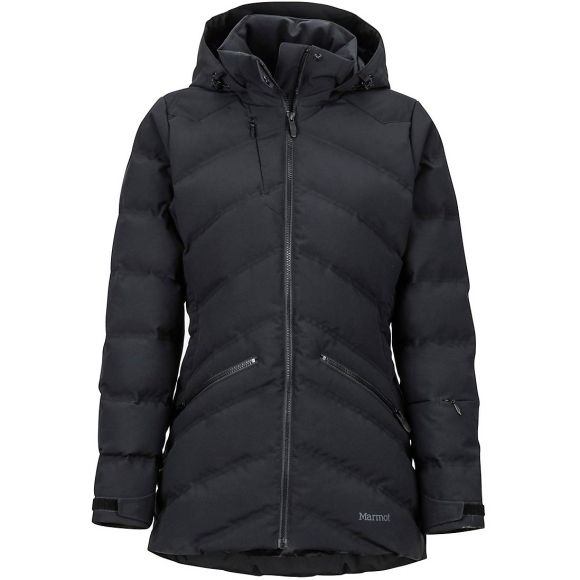 The Marmot women's Val D'Sere Jacket is a waterproof and breathable Marmot MemBrain® fabric and 700 fill-power-down deliver an unbeatable combination of reliable warmth and water-resistance for days when the weather forecast is ever-changing. This jacket boasts built-in Angel-Wing Movement™, which ensures you're able to retain your full range of mobility and layer easily. Take advantage of features like an attached helmet-compatible hood, a mesh goggle pocket, and a powder skirt that prevents snow from creeping in. An elastic drawcord hem blocks drafts, while VELCRO® closure cuffs adjust for a customized fit. A concealed ski pass pocket, as well as multiple zippered chest, hand, sleeve, and internal pockets stow the essentials you need.